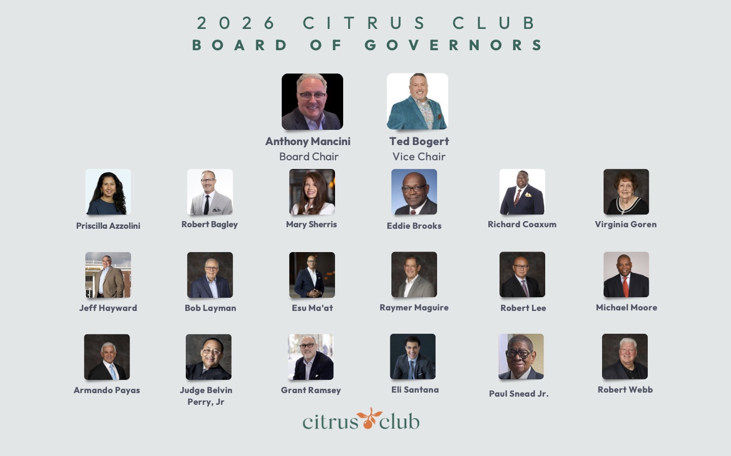 Members of Citrus Club's Board of Governors are professional civic and community leaders of our vibrant community. The goal of the board is to support club leadership in creating the best professional and social membership founded on building relationships and enriching lives.